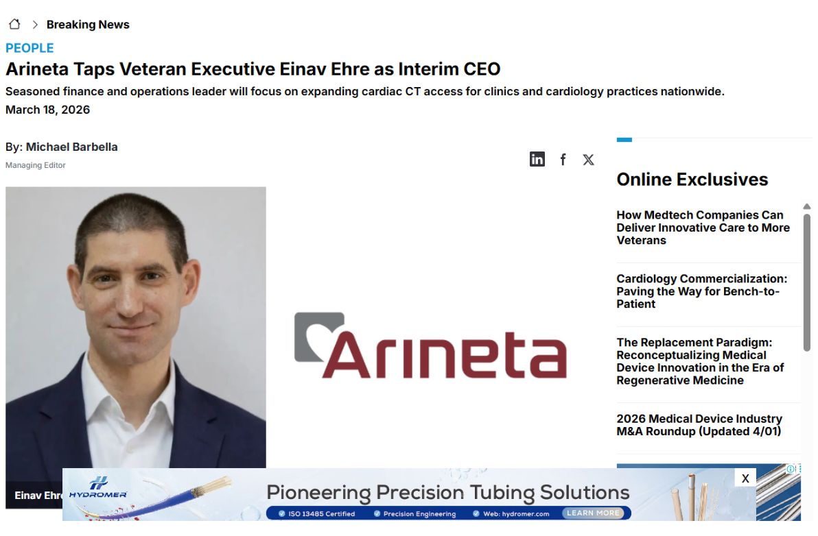 Arineta Taps Veteran Arineta Taps Veteran Executive Einav Ehre as Interim CEO to Drive Continued Growth of its Cardiac CT Solutions Seasoned finance and operations leader will focus on expanding cardiac CT access for clinics and cardiology practices nationwide. Arineta February 9, 2026