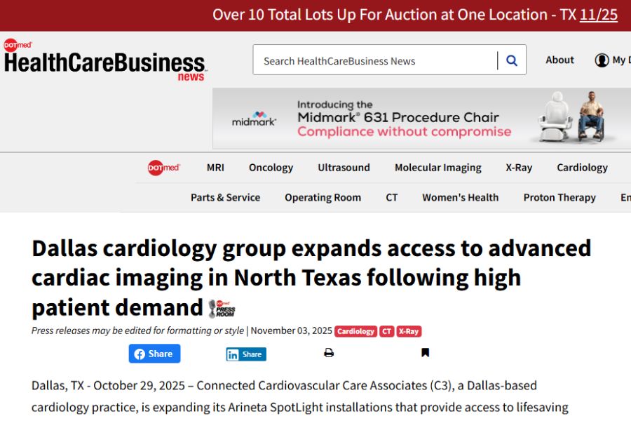 Dallas, TX – October 29, 2025Connected Cardiovascular Care Associates (C3), a Dallas-based cardiology practice, is expanding its Arineta SpotLight installations that provide access to lifesaving cardiac imaging with the addition of Arineta’s SpotLight at its Rockwall location. C3 was the first practice in the state to offer this cutting-edge technology in-house, helping patients avoid the long waits and higher costs often associated with hospital imaging centers. After strong patient and physician response to its first installation, C3 will now bring Arineta’s CT scanner to its Heath, TX practice to broaden availability to advanced imaging for Rockwall-area patients.