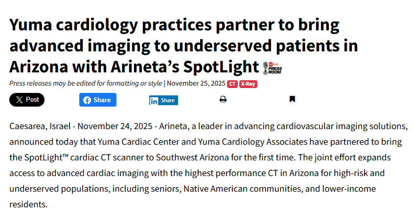 Caesarea, Israel – November 24, 2025 – Arineta, a leader in advancing cardiovascular imaging solutions, announced today that Yuma Cardiac Center and Yuma Cardiology Associates have partnered to bring the SpotLight™ cardiac CT scanner to Southwest Arizona for the first time. The joint effort expands access to advanced cardiac imaging with the highest performance CT in Arizona for high-risk and underserved populations, including seniors, Native American communities, and lower-income residents.